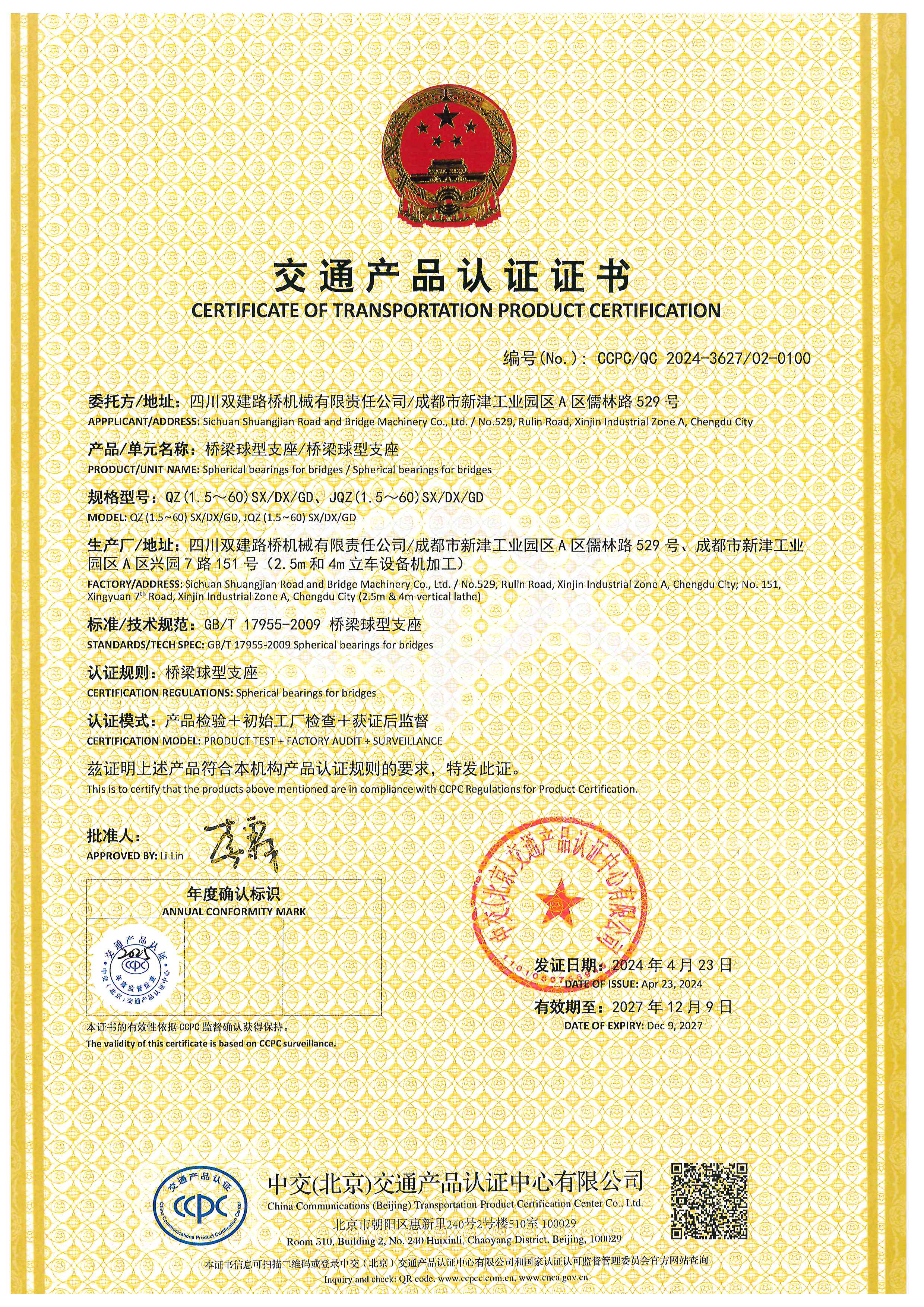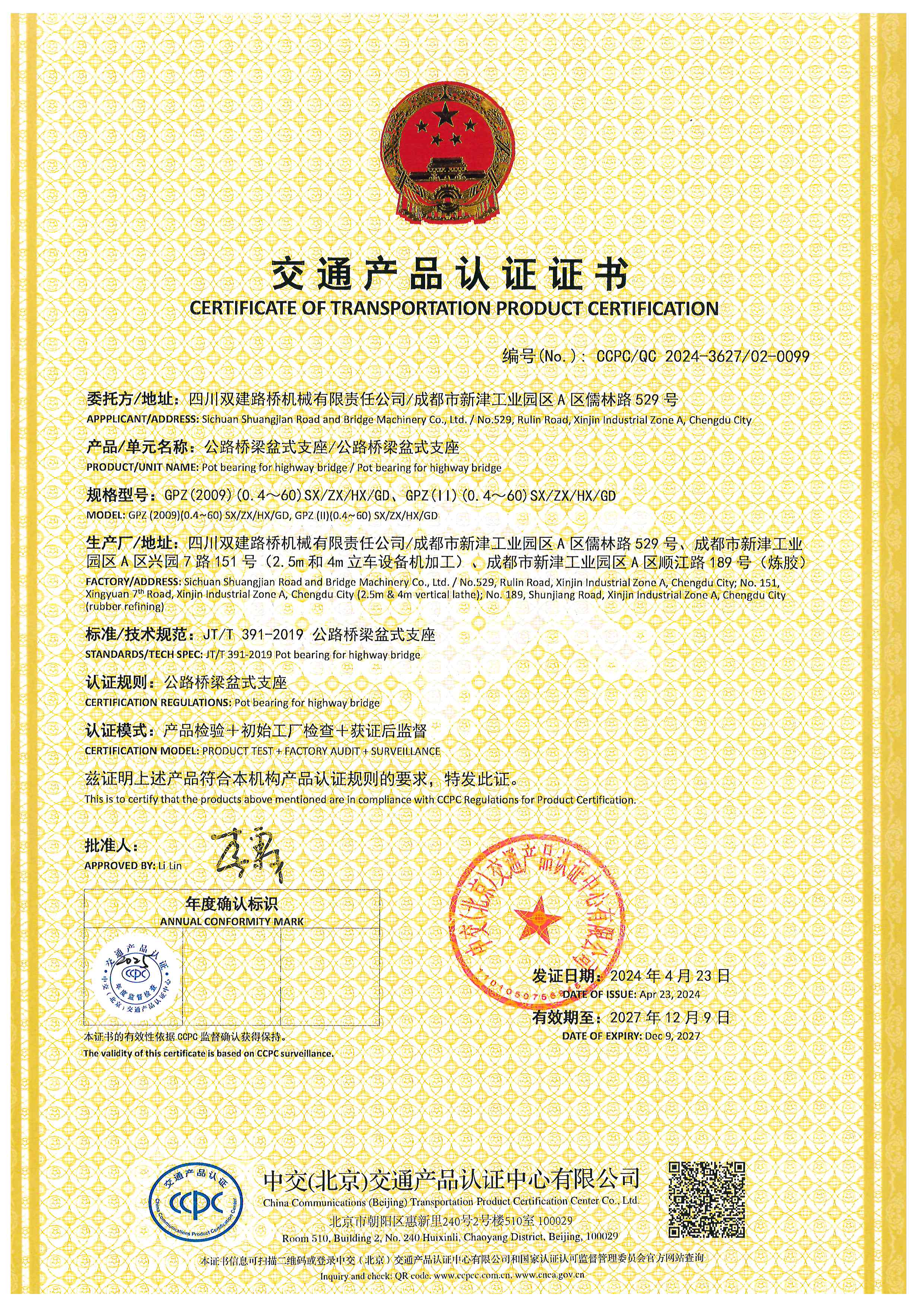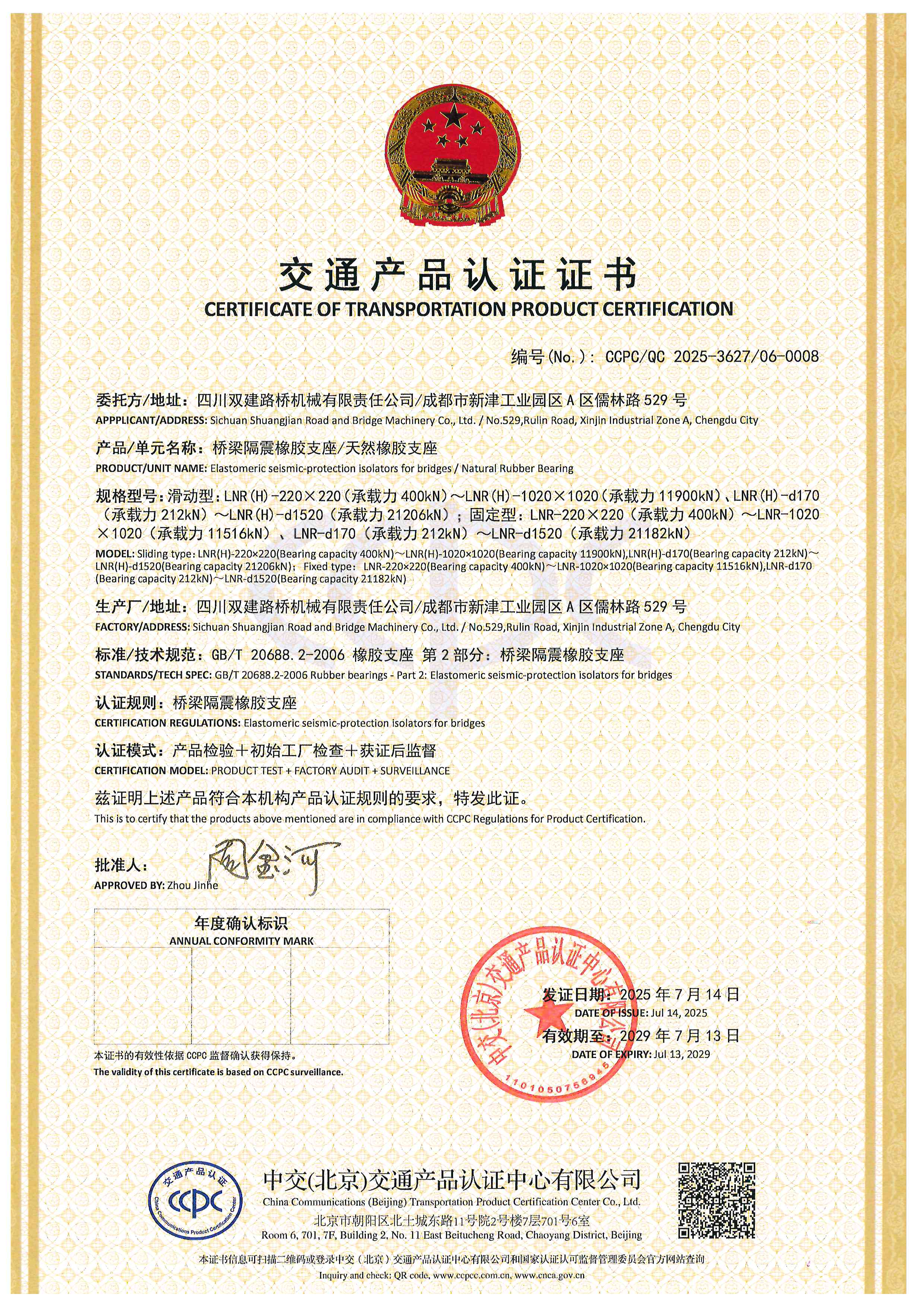 交通产品CCPC认证证书-桥梁隔震橡胶支座