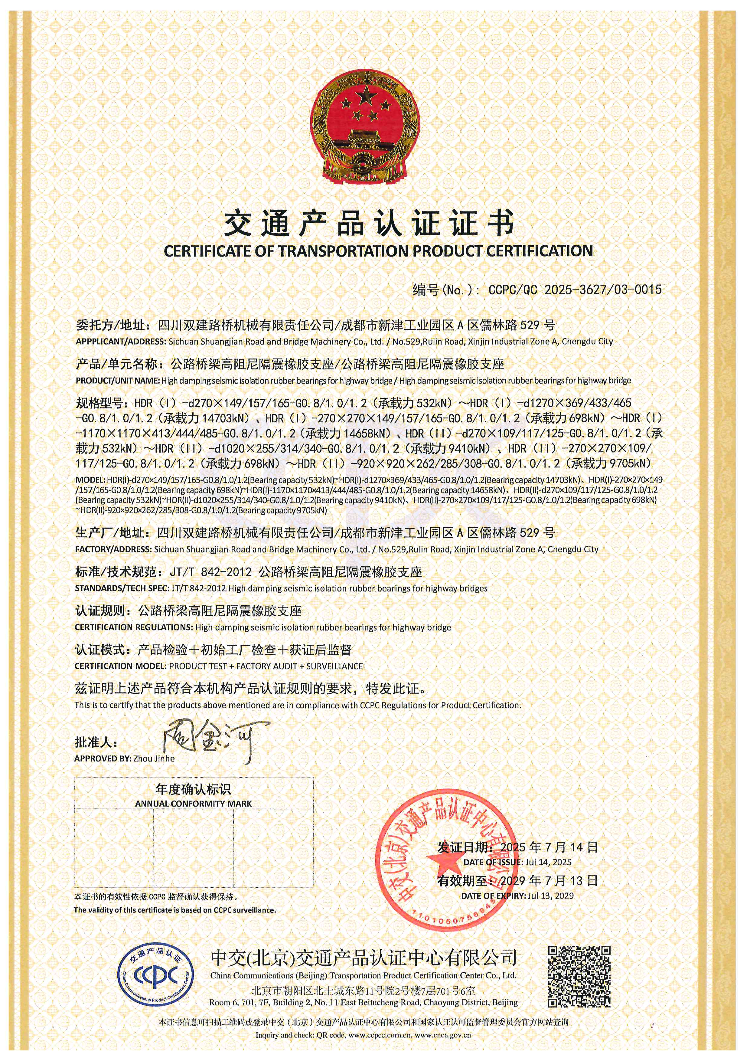 交通产品CCPC认证证书-高阻尼隔震橡胶支座